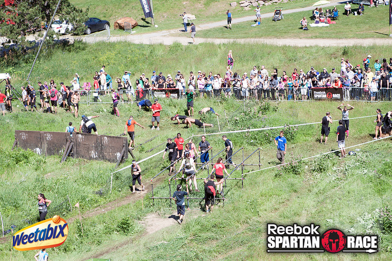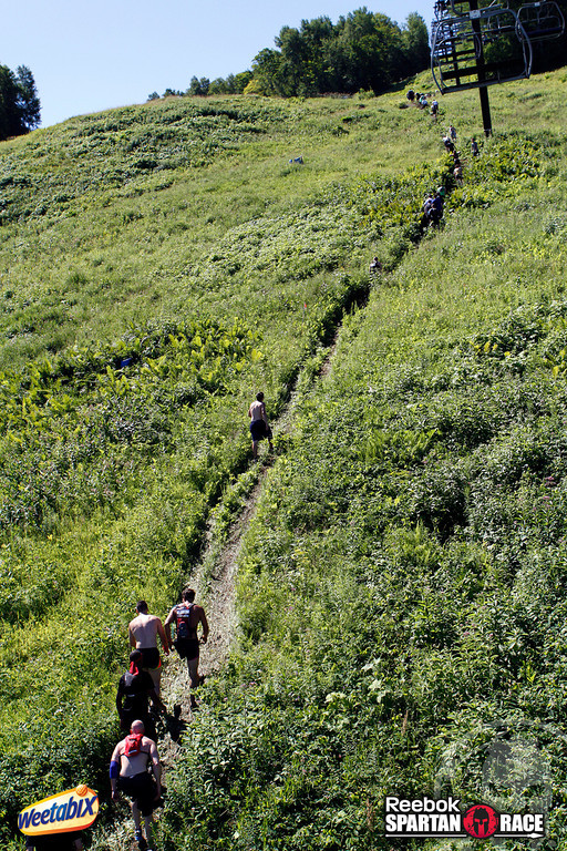 The race started out with a run directly up a ski slope, which very quickly turned into an energy-sapping and demoralizing trudge. There were a couple relatively easy obstacles on top, then back down a slope that was just a touch too steep to run down controllably, and just a touch too flat to crab-walk down consistently, so I ended up doing a mix of the two as terrain required. We hit the cargo nets, the Hercules hoist, and the first water station, and back up the mountain.
