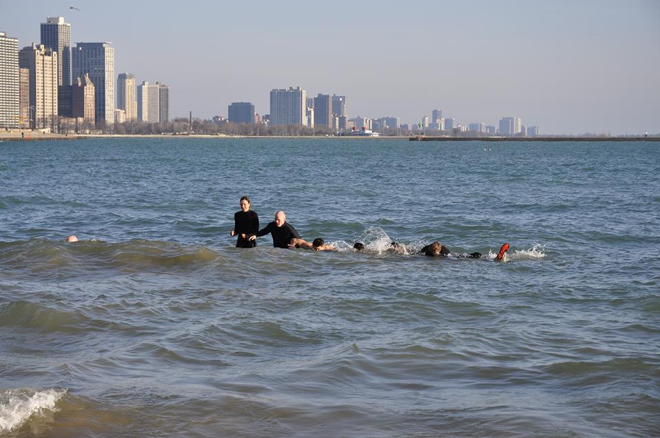 We linked arms, went out to belly depth, turned to face the shore, and awaited Cadre’s signal. When he gave us a thumb-down, we all went under. I came back up and say he was signalling to do it again. get the team together, ready, okay, back under. When I came back up Cadre was calling us back to the beach.