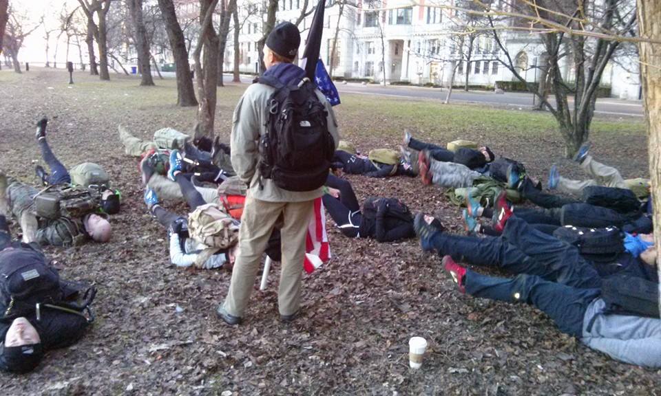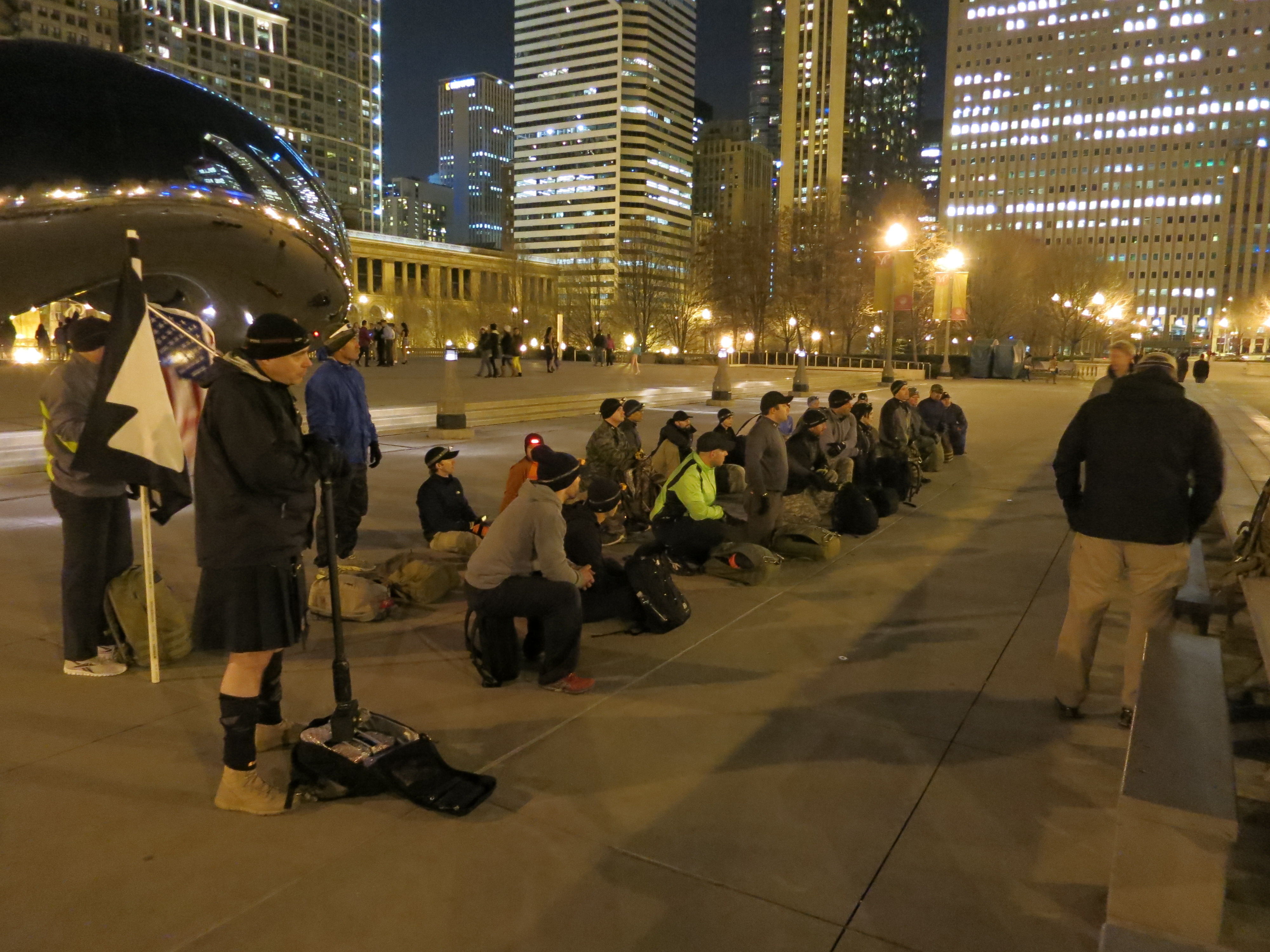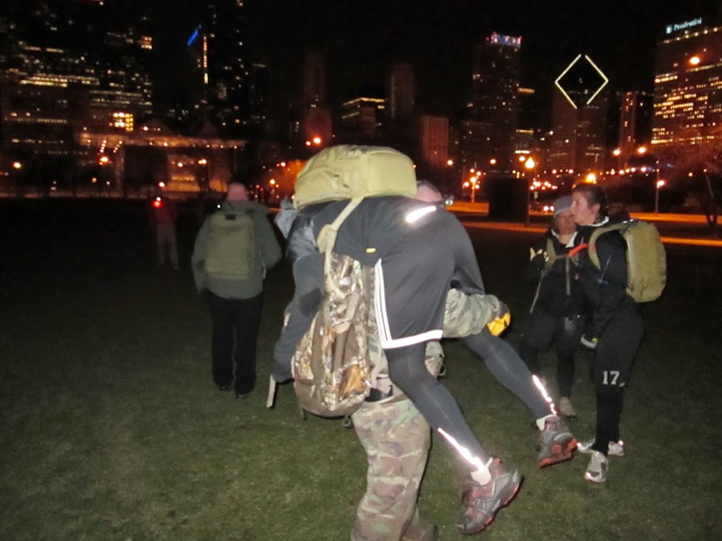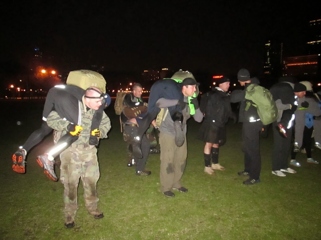 Our Cadre (going by the highly improbable name of Surfhog) arrived, gave us the usual instructions, and appointed a team leader to make certain we all had our required gear squared away. He told us his background, announced, “It begins!” and lead us off at a pace that many of us struggled to keep up with. Along the way he punished mistakes that we made with designating casualties, meaning the person he pointed to had to be carried by the rest of the team. We reached a park and started the welcome party.
