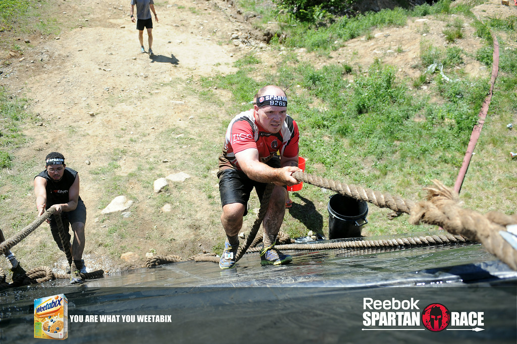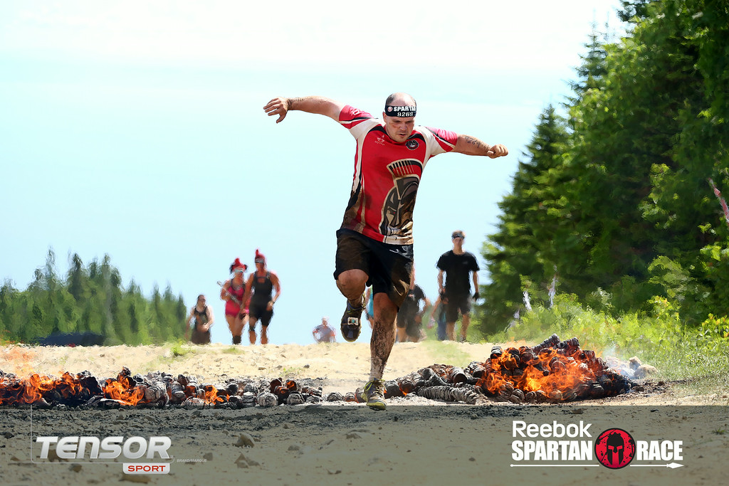 5 minutes away perhaps, but on the other side of 2 obstacles. I made it about 5 feet up the rope climb, did my burpees, through the net crawl and to the water station. Getting hydration back where I needed it helped a lot. I was still not at full strength, but good enough to carry on. Down the hill, sand bags, atlas stones. Perhaps a touch slower than normal, but much better than that second uphill. After the atlas carry, back up the hill to the fire jump: