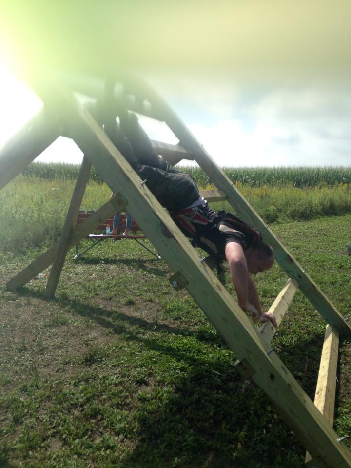 The next obstacle that sticks out in my mind is the confidence climb. It sticks out in my mind because it is one of the obstacles that frightens me, and that I gave up on halfway though at GR Nasty. This time, I made it through. Although I did discover that the very top is not a fun place to have a calf cramp.