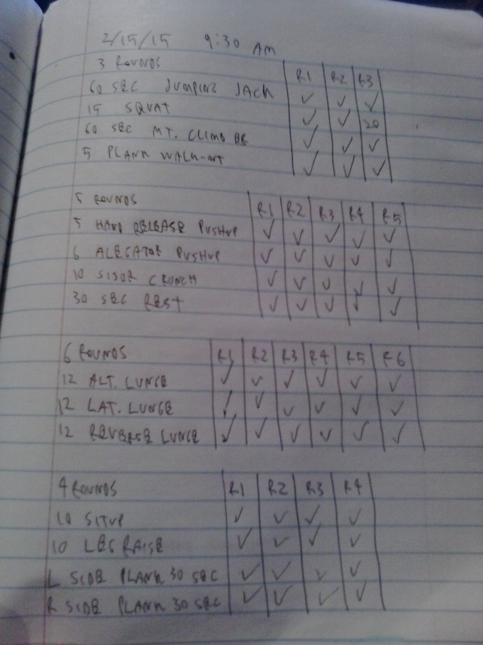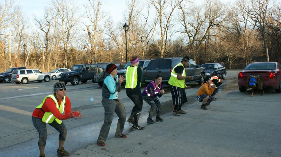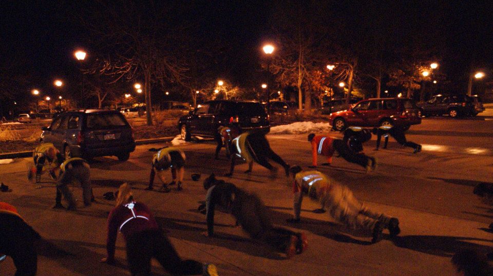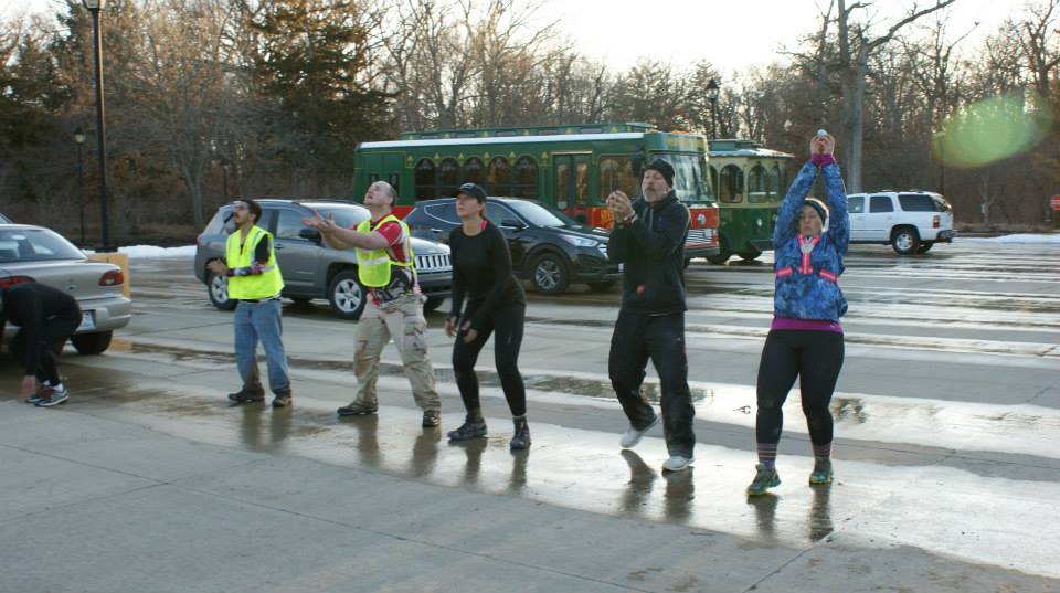 Our cadre, Ande and Rick, lead us through warm-up calisthenics, squats, burpees, flutter kicks, an insane number of mountain climbers, etc.