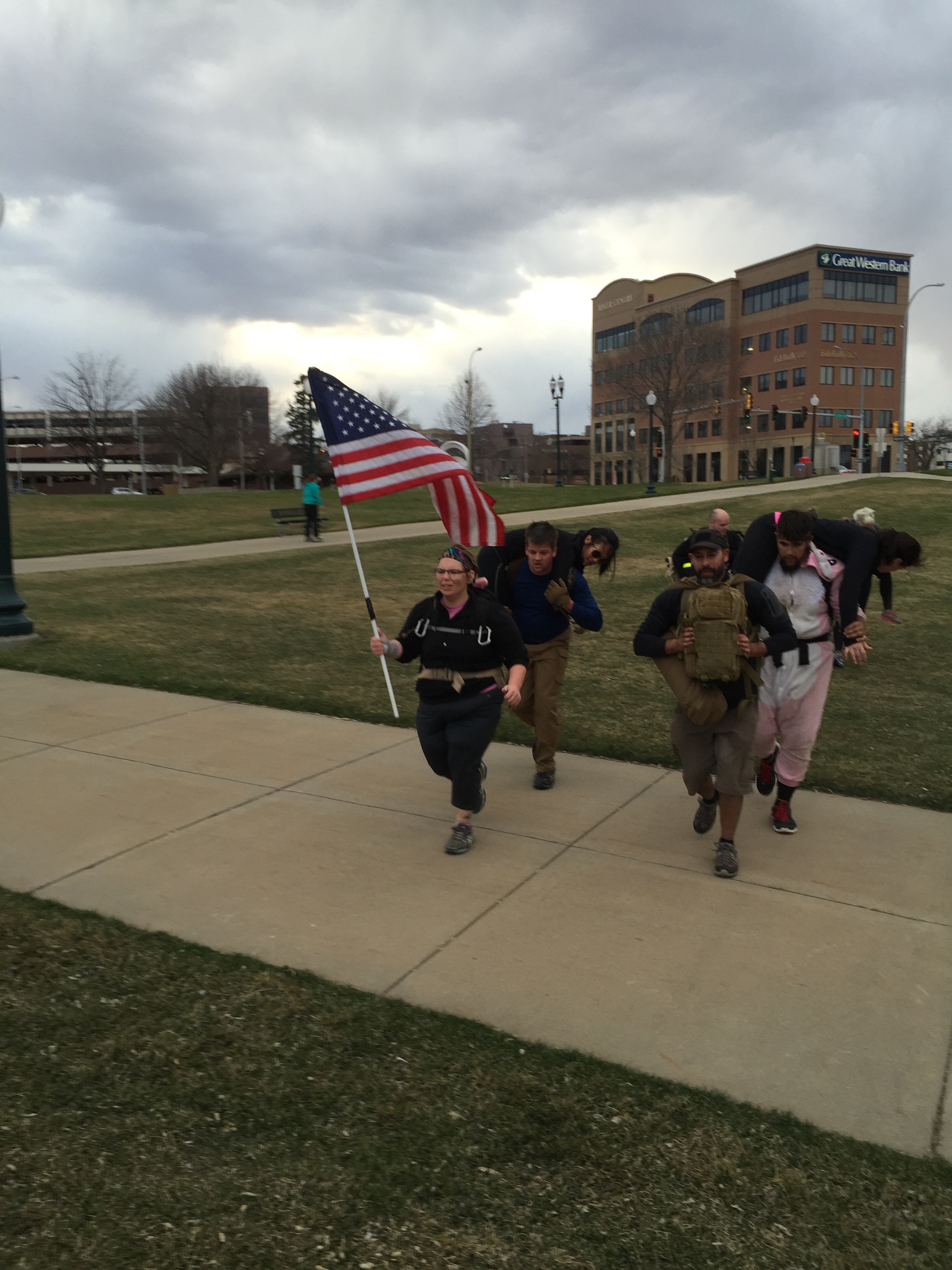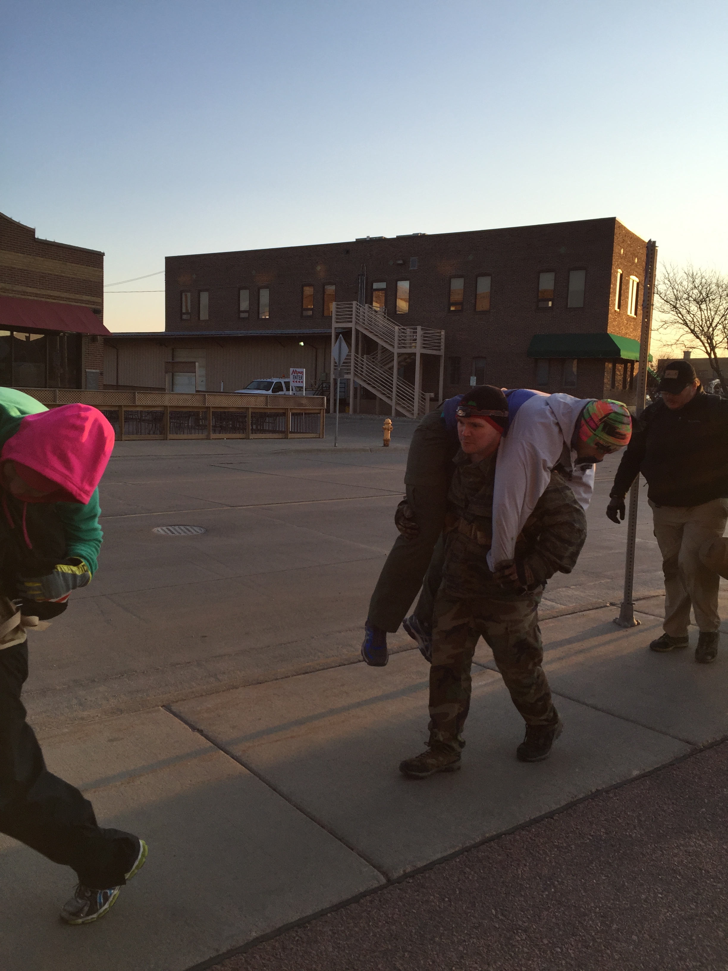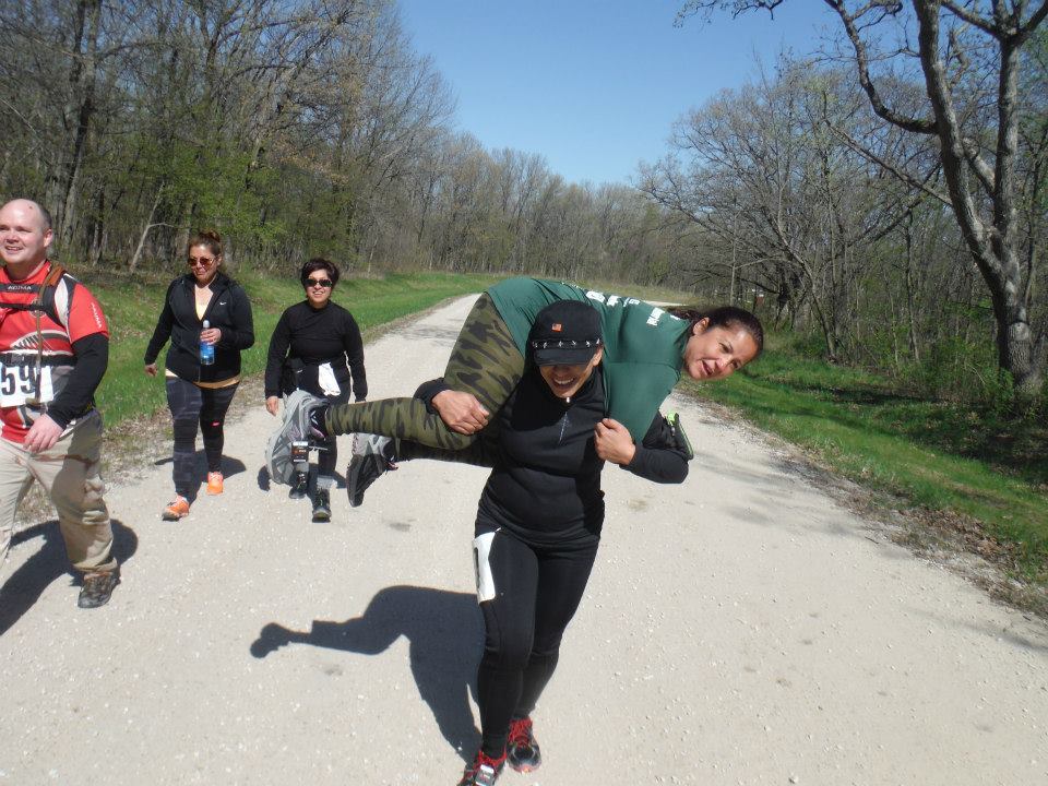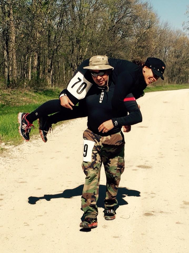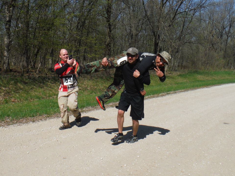 Next checkpoint, drop rucks and move on unloaded. The joking and shenanigans continued as we moved. One of the teammates jokingly said that she needed carried, so this happened: